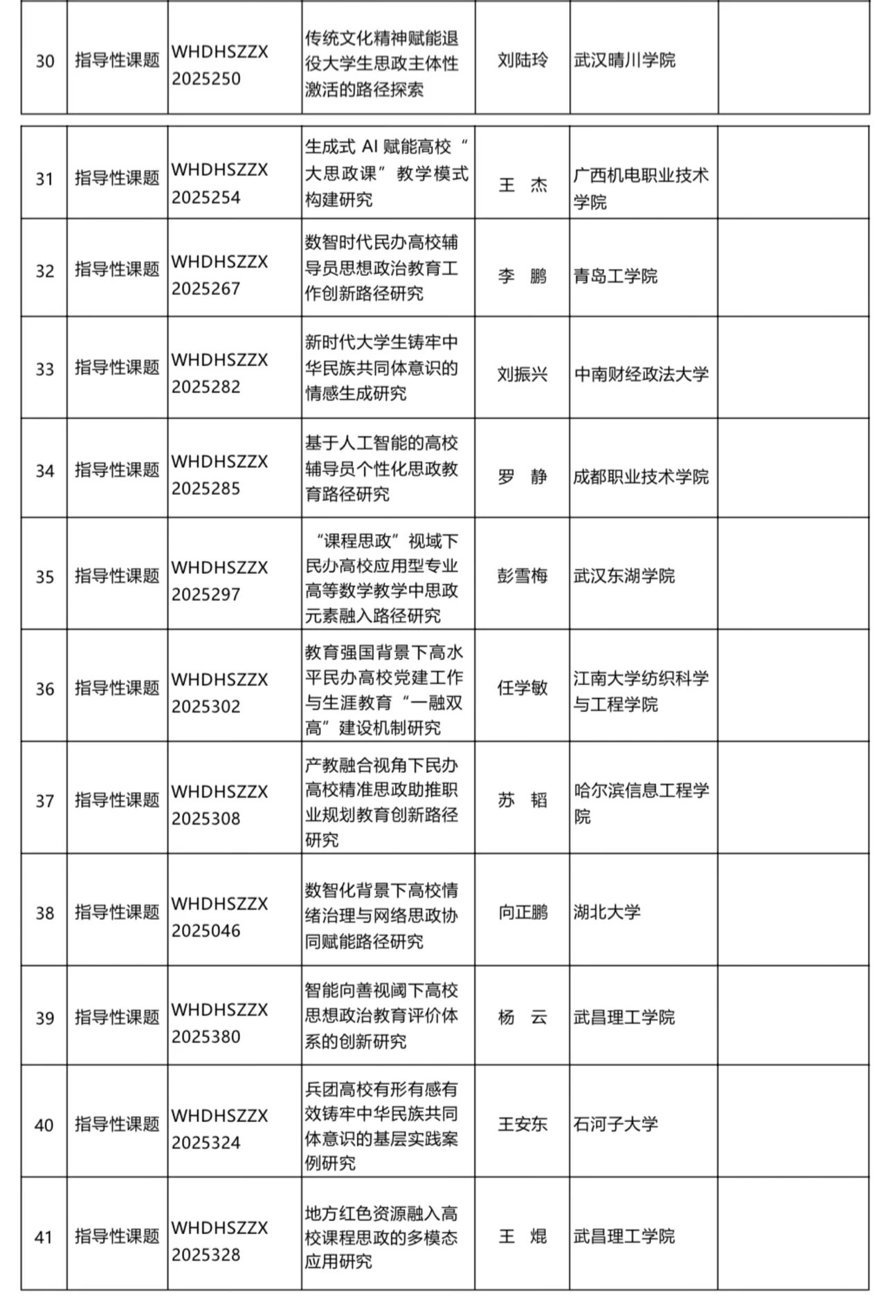 (通讯员:孙建伟 编辑:姚瑶)近日,教育部高校思想政治工作创新发展中心公布了2025年度专项研究课题立项名单,武汉晴川学院辅导员刘陆玲申报的课题《传统文化精神赋能退役大学生思政主体性激活的路径探索》成功入选。