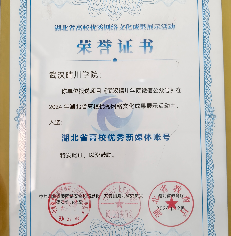 △ 学校官方微信公众号获评2024年度“湖北省高校优秀新媒体账号”(为湖北省同类高校中唯一获奖单位)