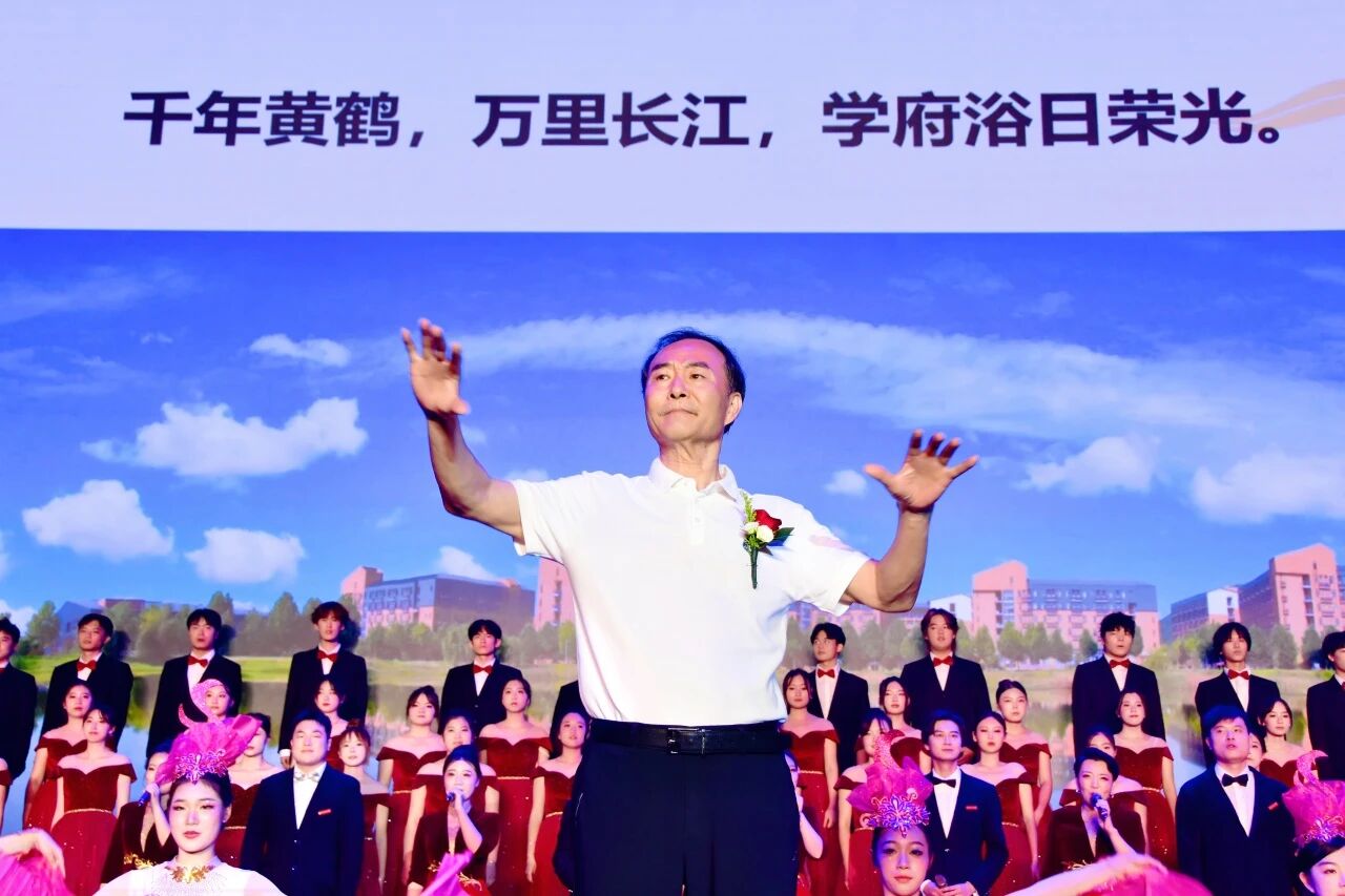 △ 学校董事长、校长汪彬教授指挥合唱校歌《晴川颂》《黄河大合唱》