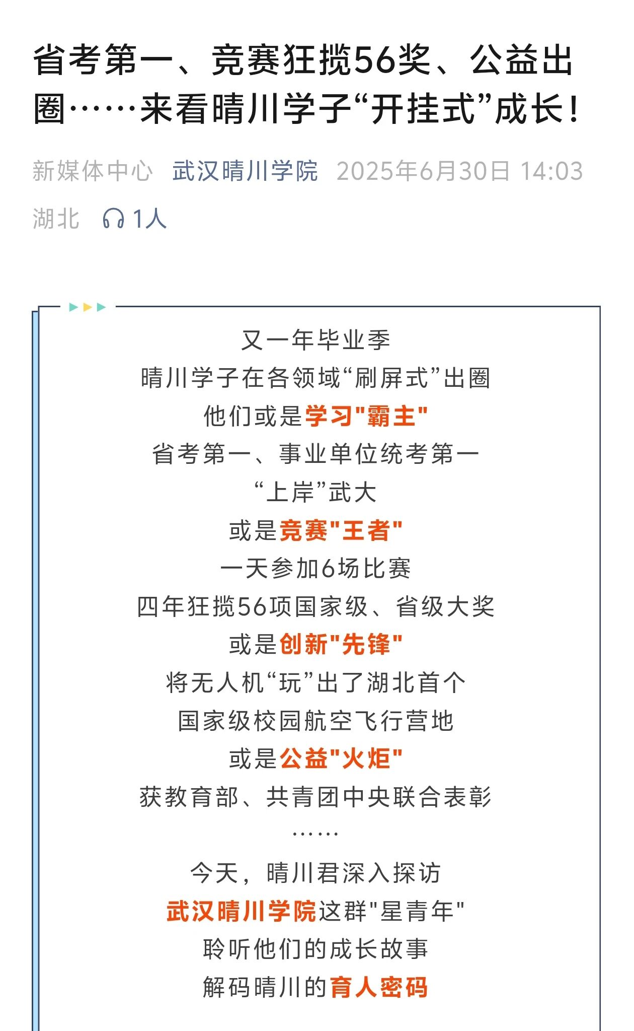 《省考第一、竞赛狂揽56奖、公益出圈……来看晴川学子“开挂式”成长》