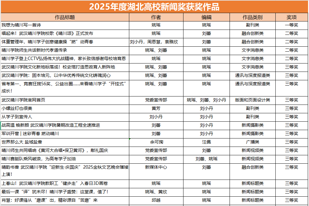 在本次评选中,武汉晴川学院的获奖作品覆盖面广、内容多元,涵盖了新闻标题、文字消息、通讯与深度报道、新闻摄影、融合创新、副刊等多个类别。这些作品紧扣时代脉搏,深耕校园沃土,生动记录了学校在实践教学、人才培养、创新创业、榜样人物及校园文化建设等方面的鲜活故事和丰硕成果,是“讲好晴川故事”的集中体现。
