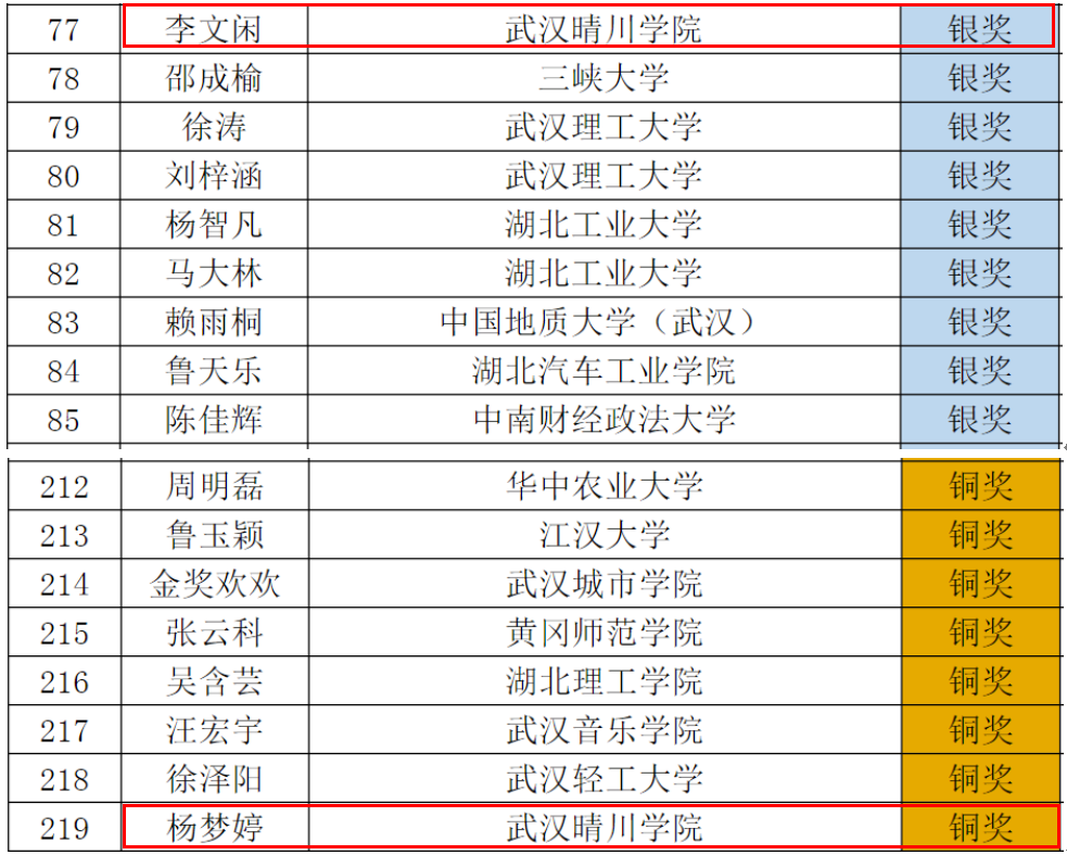 (通讯员:柯可 刘蕾)近日,2025年“外研社·国才杯”“理解当代中国”全国大学生外语能力大赛(湖北赛区)英语组综合能力赛项决赛成功落下帷幕。本次大赛汇聚了来自武汉大学、华中科技大学、华中师范大学、中南财经政法大学等全省70所高校的432名优秀学子,同场角逐,竞争激烈。在这场代表湖北省大学生外语最高水平的较量中,武汉晴川学院英语专业学生李文闲、杨梦婷凭借过硬的综合素养脱颖而出,分别荣获银奖和铜奖,阮肖艳、巴煜杰、贾茜然和胡美琪四位同学获得优胜奖,展现了晴川学子的卓越风采。