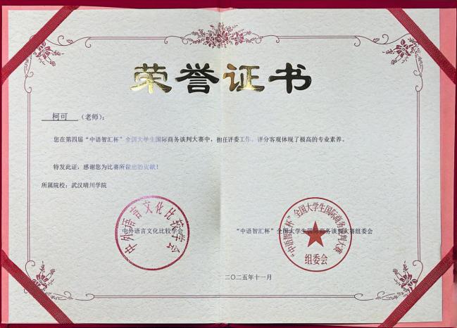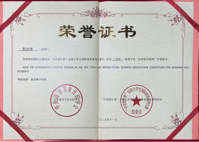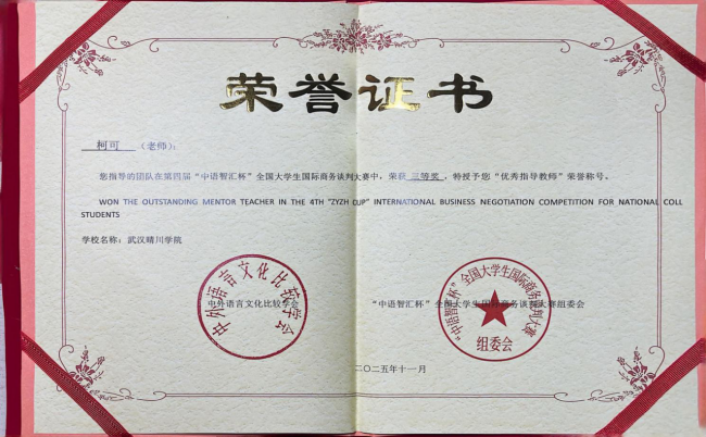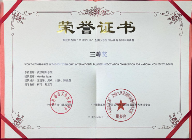 (来源:外国语学院 通讯员:柯可)近日,在第四届“中语智汇杯”全国大学生国际商务谈判大赛全国总决赛中,武汉晴川学院外国语学院柯可、舒亚琴两位教师指导的队伍(团队成员:王德琳、周欢、刘畅、陈盈盈)与来自全国高校的143支晋级队伍展开激烈角逐,最终荣获全国三等奖。同时,柯可、舒亚琴老师获评“优秀指导教师”,柯可老师还应邀担任了全国决赛评委。