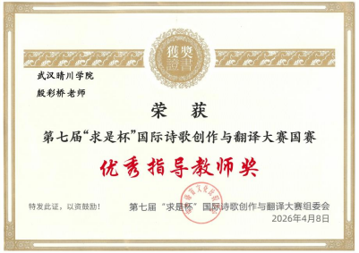 (来源:外国语学院 通讯员:房宇华)近日,第七届“求是杯”国际诗歌创作与翻译大赛获奖名单正式公布。武汉晴川学院学子在本届赛事中表现出色,共获得国家级奖项7项、省级奖项7项,实现了我校在该项高水平赛事中的突破。