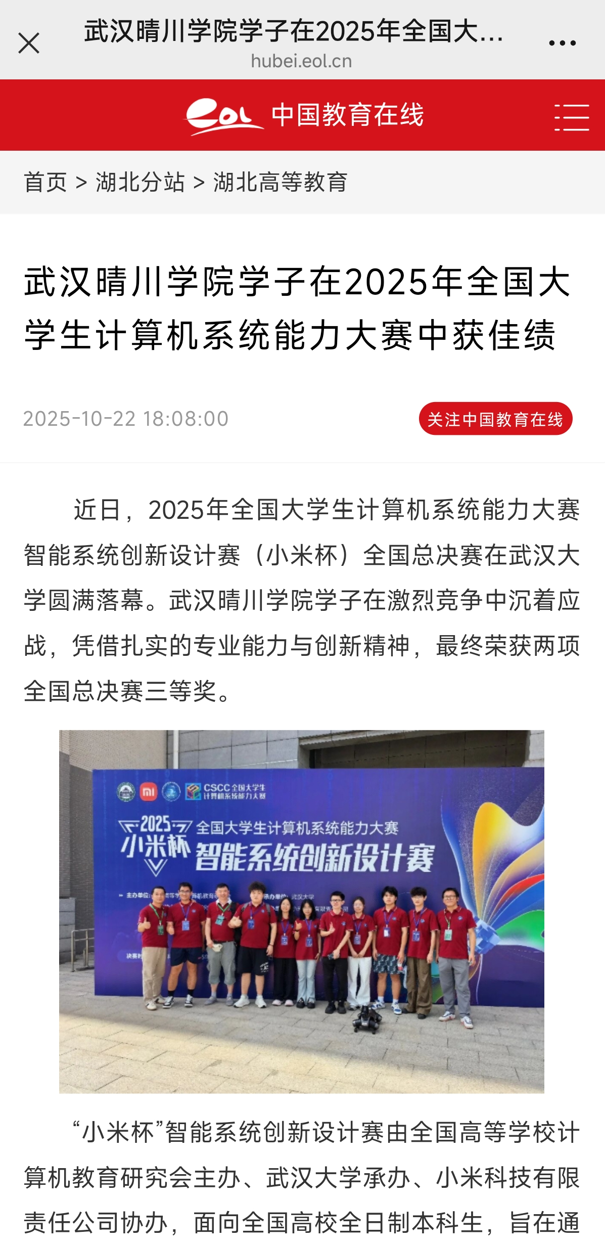 此次在2025年“小米杯”全国总决赛中取得佳绩,是武汉晴川学院在人工智能教育领域持续深耕的重要体现。学校未来将继续加强学科建设,优化课程体系,深化产教融合,努力为社会培养更多具备创新精神与实践能力的高素质智能系统人才。