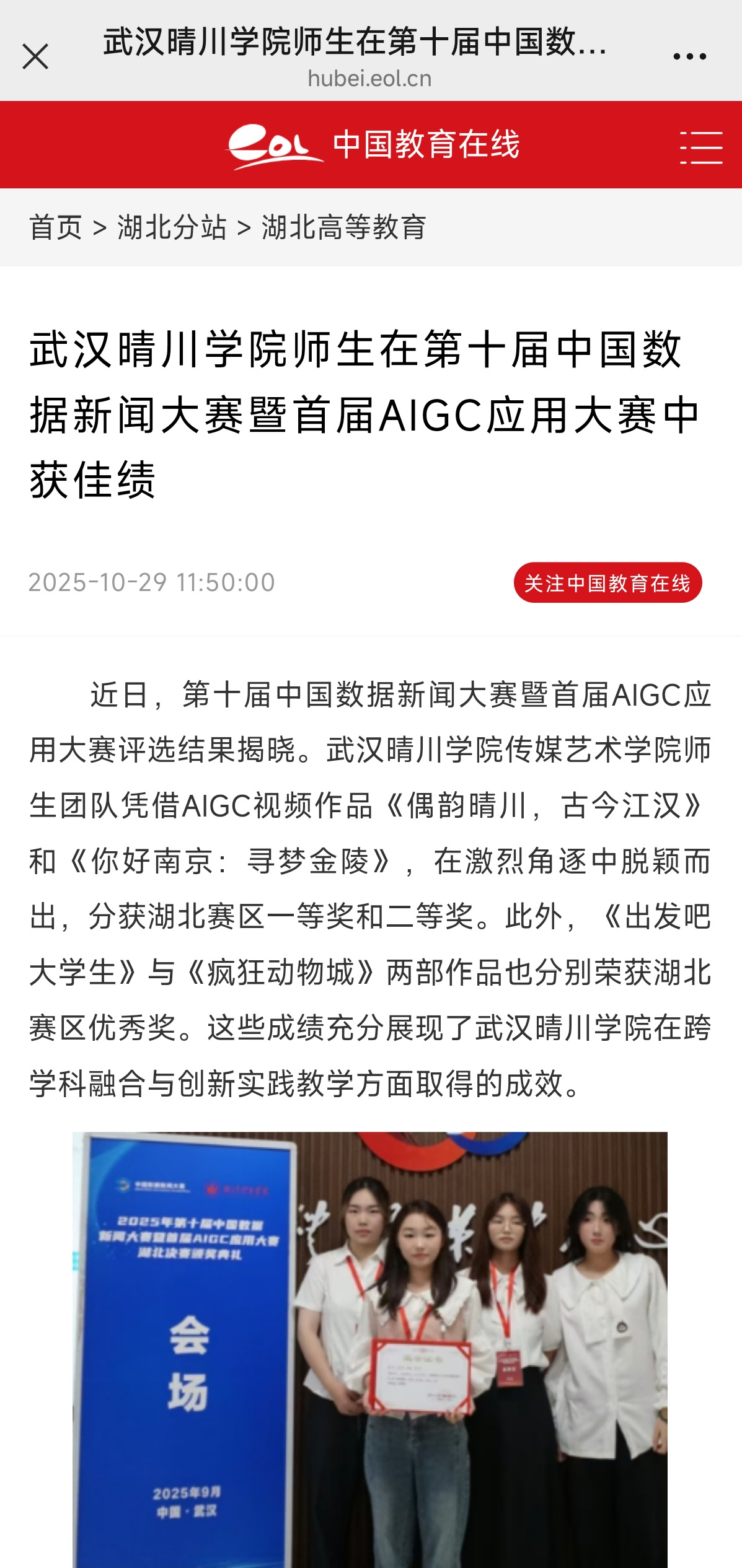 值得一提的是,两部作品已成功晋级全国总决赛,将与其他赛区团队同台竞技,展现晴川学子的风采。