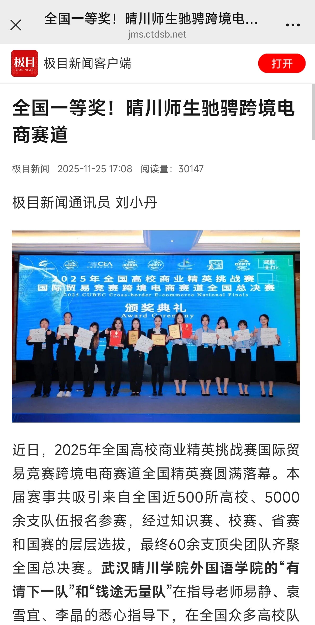 近日,2025年全国高校商业精英挑战赛国际贸易竞赛跨境电商赛道全国精英赛圆满落幕。本届赛事共吸引来自全国近500所高校、5000余支队伍报名参赛,经过知识赛、校赛、省赛和国赛的层层选拔,最终60余支顶尖团队齐聚全国总决赛。武汉晴川学院外国语学院的“有请下一队”和“钱途无量队”在指导老师易静、袁雪宜、李晶的悉心指导下,在全国众多高校队伍的激烈角逐中脱颖而出,双双斩获2025年全国商业精英挑战赛国际贸易竞赛跨境电商赛道全国总决赛一等奖、全国精英赛精英奖,全国精英赛(展洽组)一等奖,武汉晴川学院获“最佳院校组织奖”荣誉称号。
