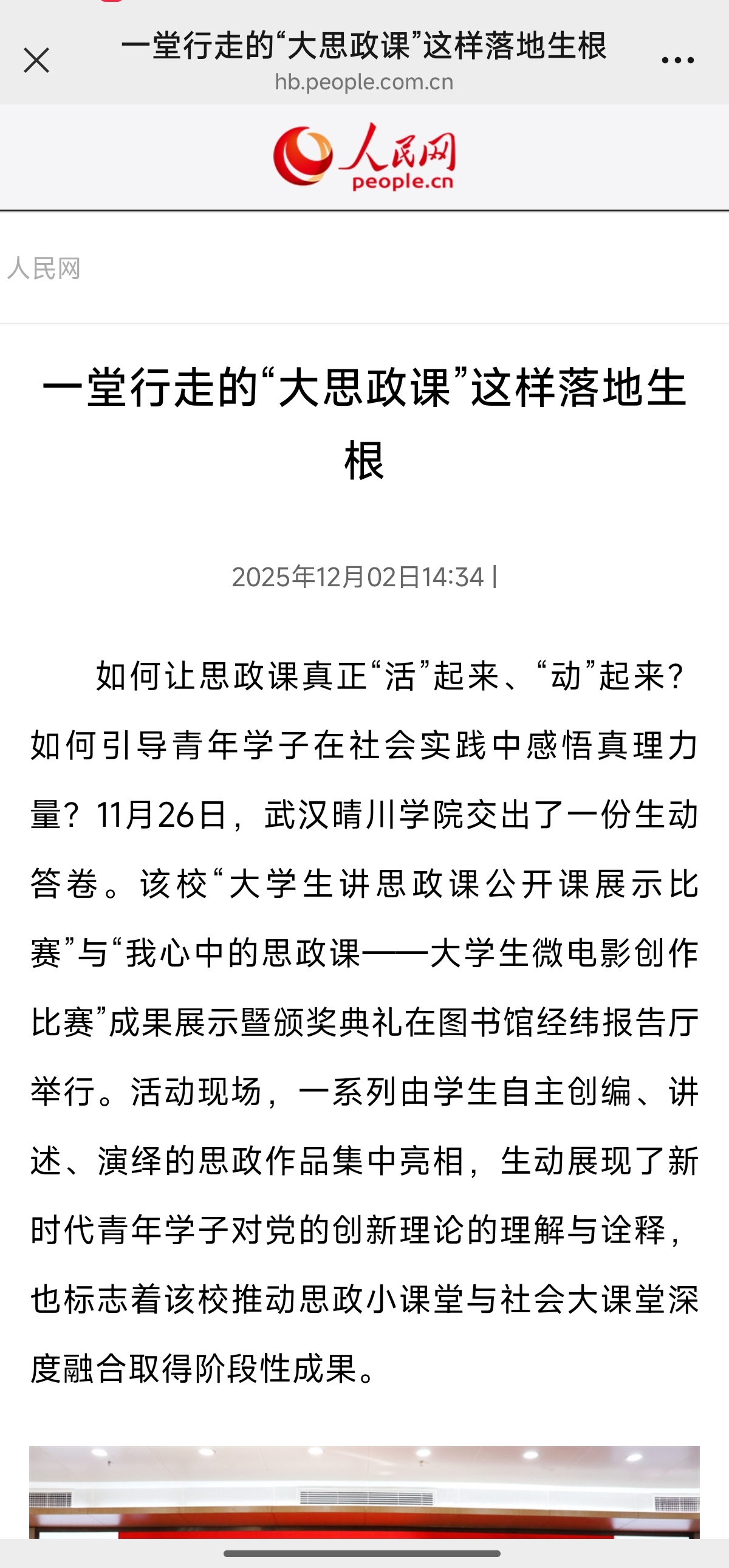 据悉,本次成果展示暨颁奖典礼是武汉晴川学院持续推进“大思政课”建设的一个缩影。学校始终致力于创新思政教育形式,拓宽育人路径,通过以赛促学、以创践思,有效激发了学生的学习主动性与创造力。学校将继续深化“大思政课”建设,不断增强思政教育的时代性与感召力,激励广大学子在火热实践中书写青春篇章,让思政育人之花在校园内外绚丽绽放。(文/图 姚瑶 施禾羽子)
