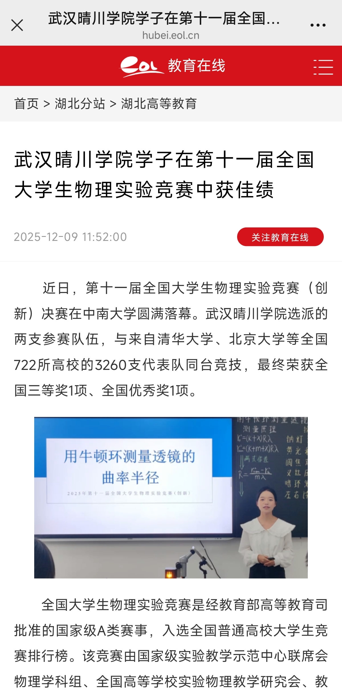 近日,第十一届全国大学生物理实验竞赛(创新)决赛在中南大学圆满落幕。武汉晴川学院选派的两支参赛队伍,与来自清华大学、北京大学等全国722所高校的3260支代表队同台竞技,最终荣获全国三等奖1项、全国优秀奖1项。