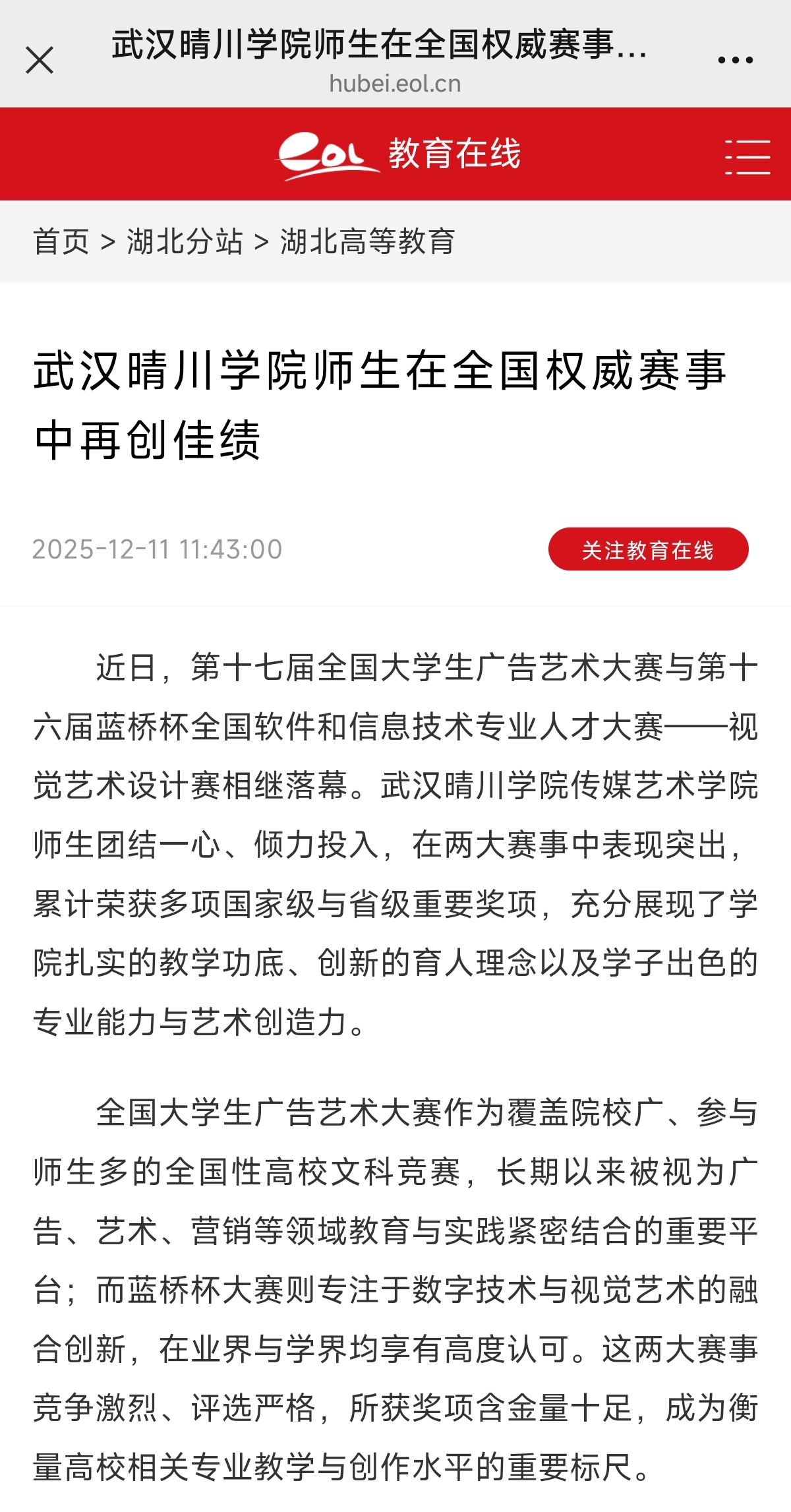 此次连续在两大赛事中取得突破,是该校传媒艺术学院师生共同努力、协同创新的生动缩影。指导教师以专业知识与赛事经验为学生护航,同学们则以热情与毅力投身创作实践,生动诠释了学院“以赛促学、以赛促练、以赛促创”的教学理念。展望未来,学校将继续积极搭建实践平台、营造创新氛围,鼓励师生在专业领域持续深耕、敢于突破,在更广阔的竞赛舞台与社会实践中绽放才华,共同书写高质量发展与人才培养的新篇章。(来源:武汉晴川学院)