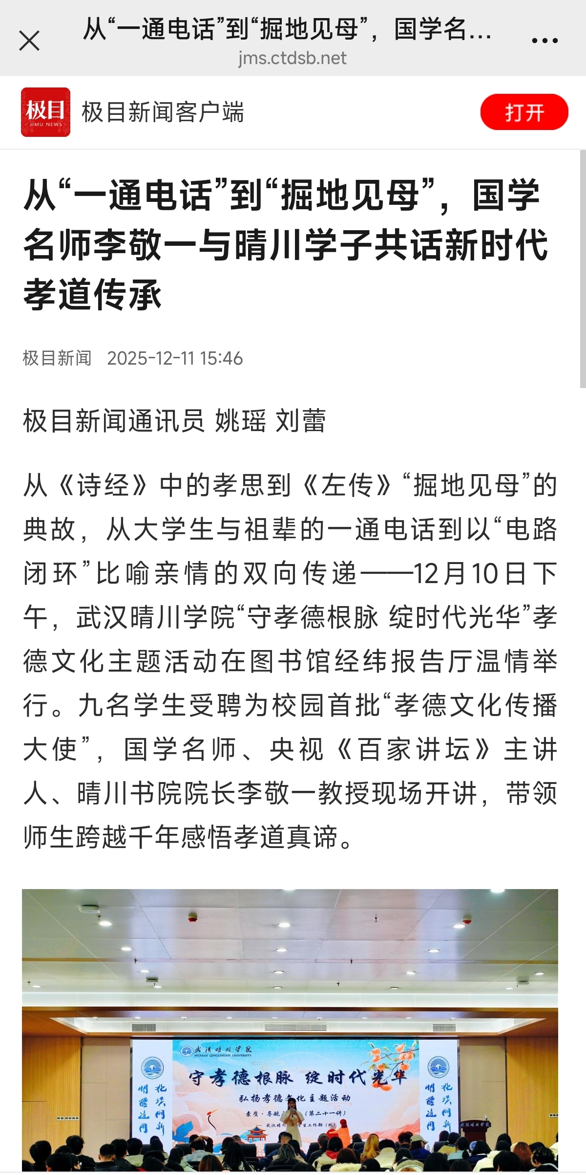 从《诗经》中的孝思到《左传》“掘地见母”的典故,从大学生与祖辈的一通电话到以“电路闭环”比喻亲情的双向传递——12月10日下午,武汉晴川学院“守孝德根脉 绽时代光华”孝德文化主题活动在图书馆经纬报告厅温情举行。九名学生受聘为校园首批“孝德文化传播大使”,国学名师、央视《百家讲坛》主讲人、晴川书院院长李敬一教授现场开讲,带领师生跨越千年感悟孝道真谛。