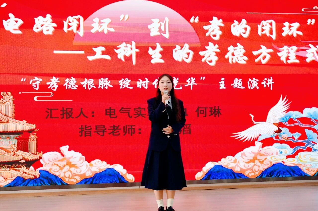 活动现场,九位学子结合自身经历,分享了他们对孝德文化的当代理解。会计学院张梦寒从一通与爷爷的电话谈起,阐述孝是“爱”的传递与延伸;机械与电气工程学院何琳用“电路闭环”比喻孝道,呼吁以技术实现爱的双向传递;外国语学院张静雯从“孝”字字形流变入手,讲述父母深夜将她抱回床铺的温暖往事。此外,多位学子或呼吁“孝在当下”,或以山海比喻亲情,或以智慧跨越距离尽孝,从不同角度诠释孝心,共同勾勒出一幅融传统底蕴与时代气息于一体的孝德实践画卷。