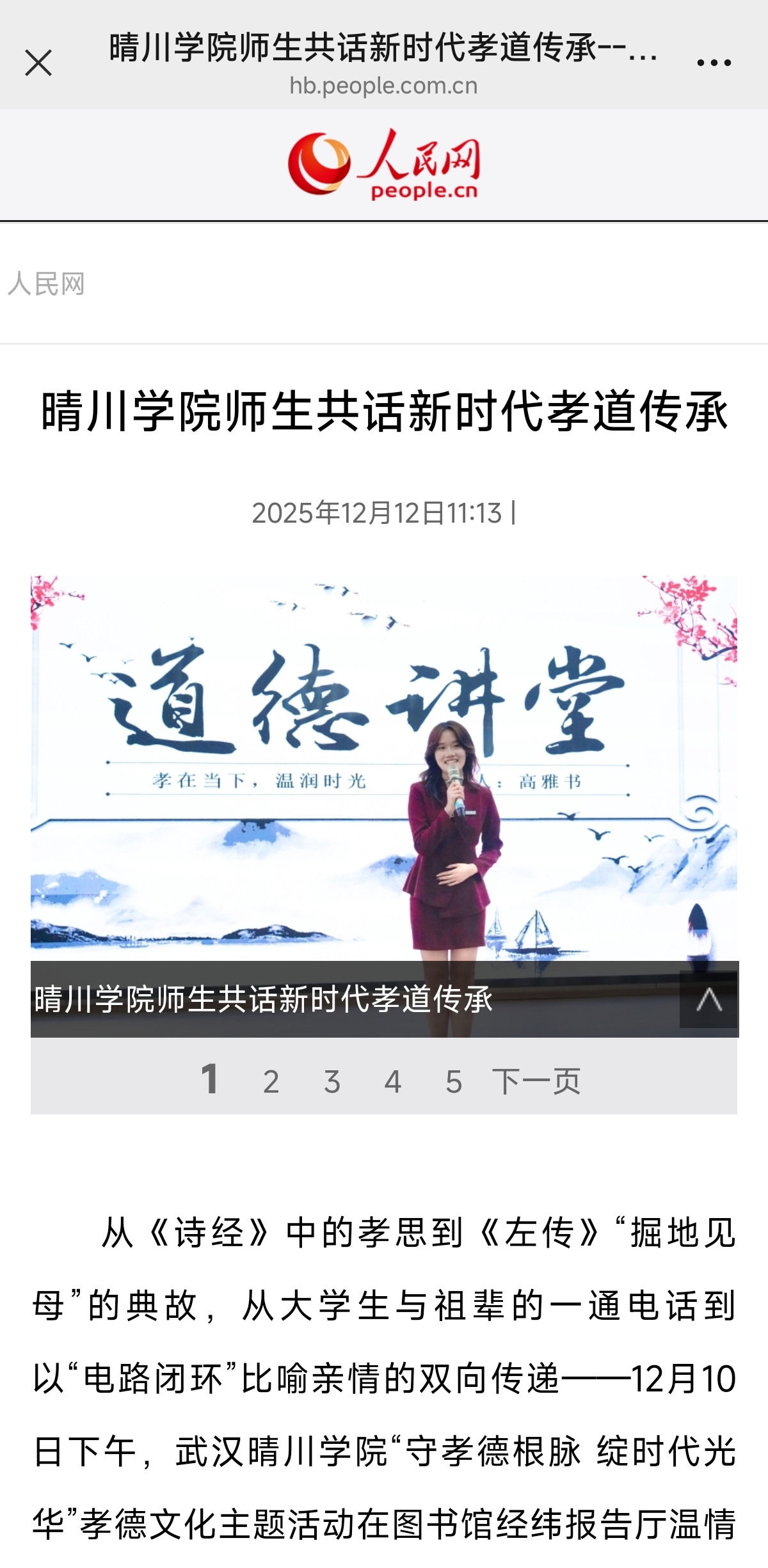 近年来,武汉晴川学院以孝文化为切入点,构建了课堂教学、实践养成与文化传播相结合的育人体系。学校通过主题演讲、书画影展、社会实践等系列活动,持续营造知孝、懂孝、行孝、传孝的校园氛围,为培养兼具传统底蕴与现代素养的时代新人提供深厚的文化滋养。(图/文 姚瑶 刘蕾)