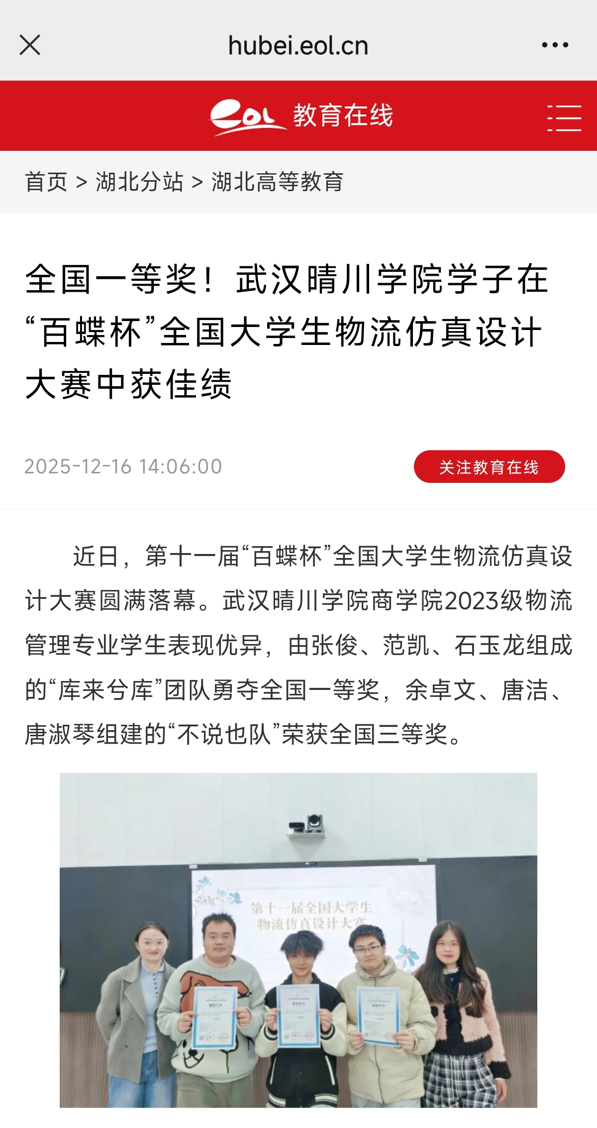 此次获奖不仅是对参赛学生专业素养和实践能力的充分肯定,也是学校应用型人才培养成效的生动体现。武汉晴川学院始终秉承“育人为本、德育为先、教学为基、质量为要”的办学理念,持续深化高素质应用型人才培养模式,注重培养学生的创新精神和实践能力。学校搭建的优质教学资源与多样化实践平台,为学子备赛参赛提供了有力支撑,助力他们在更广阔的舞台上展现晴川风采。未来,学校将继续优化“以赛促教、以赛促学、赛教融合”的培养模式,拓展更广阔的实践育人空间,为学子成长成才提供丰沃土壤,持续为社会输送具有家国情怀、扎实学识和卓越实践能力的高素质应用型人才。(通讯员:李蓓 刘小丹)