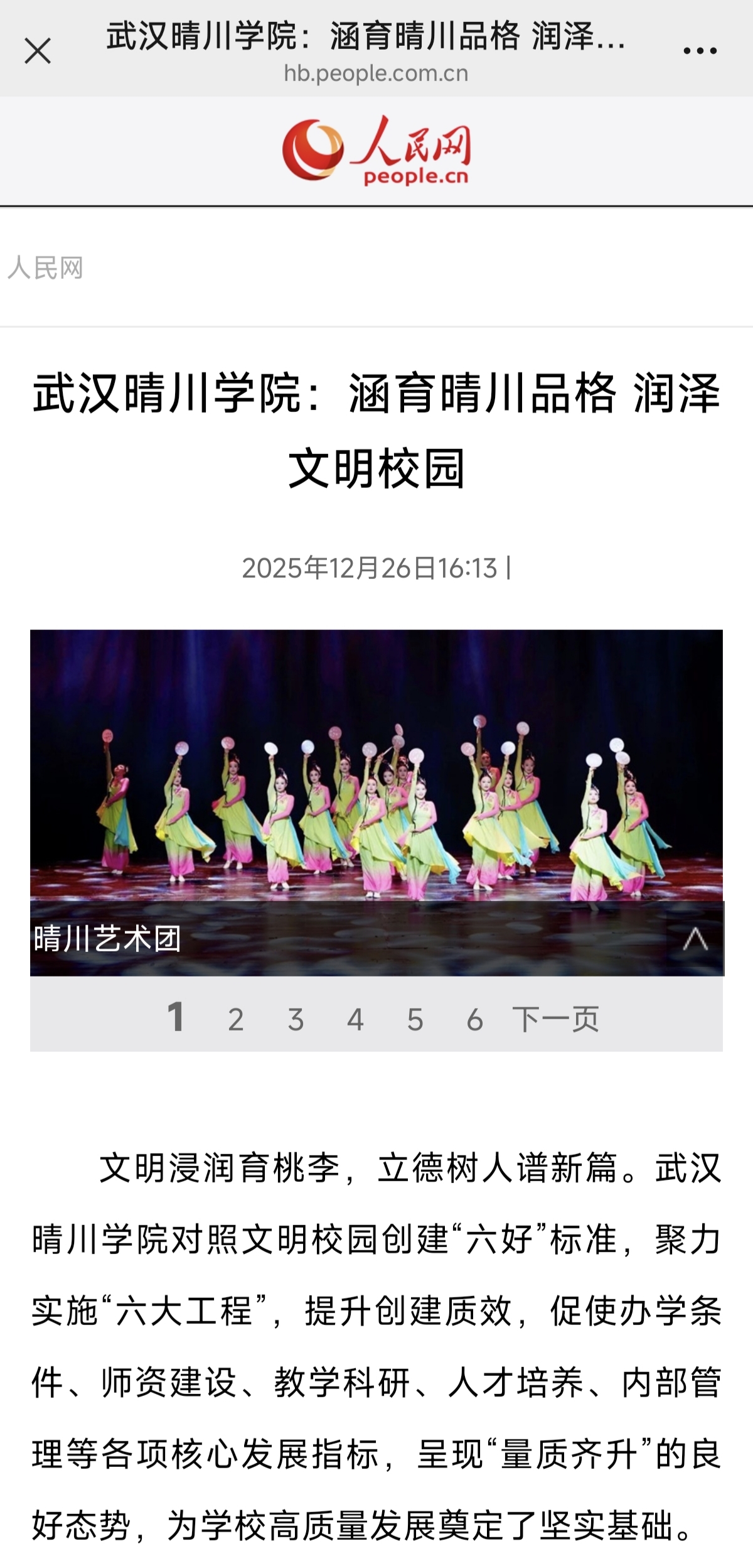 文明浸润育桃李,立德树人谱新篇。武汉晴川学院对照文明校园创建“六好”标准,聚力实施“六大工程”,提升创建质效,促使办学条件、师资建设、教学科研、人才培养、内部管理等各项核心发展指标,呈现“量质齐升”的良好态势,为学校高质量发展奠定了坚实基础。