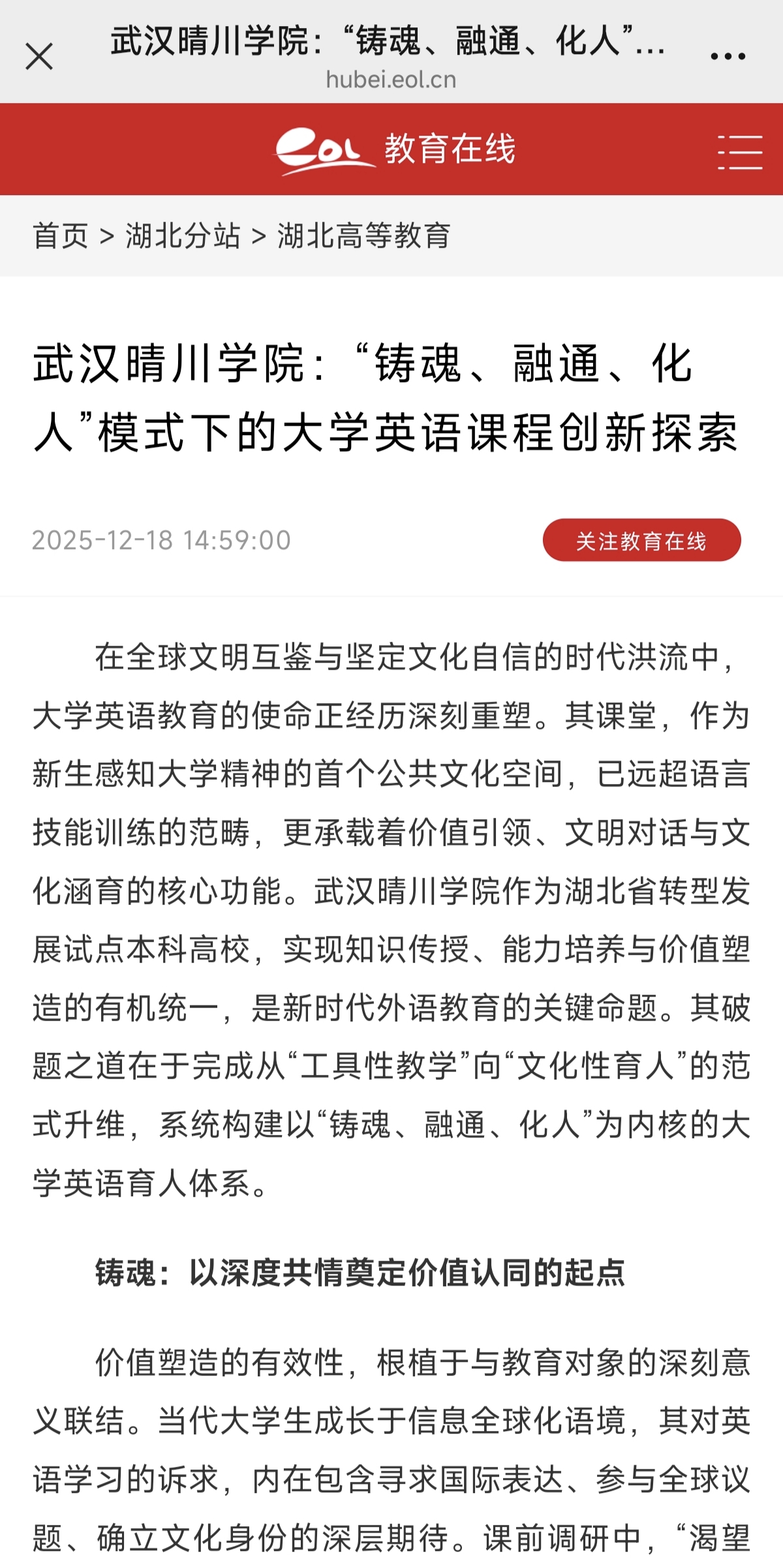 大学英语课程思政的深化,本质上是向教育育人本真的回归。它要求我们自觉将教学实践置于国家发展与文明进步的大格局中,把课堂系统打造为“铸魂”的熔炉、“融通”的桥梁、“化人”的园地。这条以文化人、以课载道的探索之路,旨在培养的绝非仅具沟通技能的应用者,而是具备坚实文化主体性、卓越全球胜任力与深厚家国情怀的时代新人。他们将在中国与世界的深度对话中,真正肩负起文明交流互鉴的光荣使命。(通讯员:万欣 胡焰初)