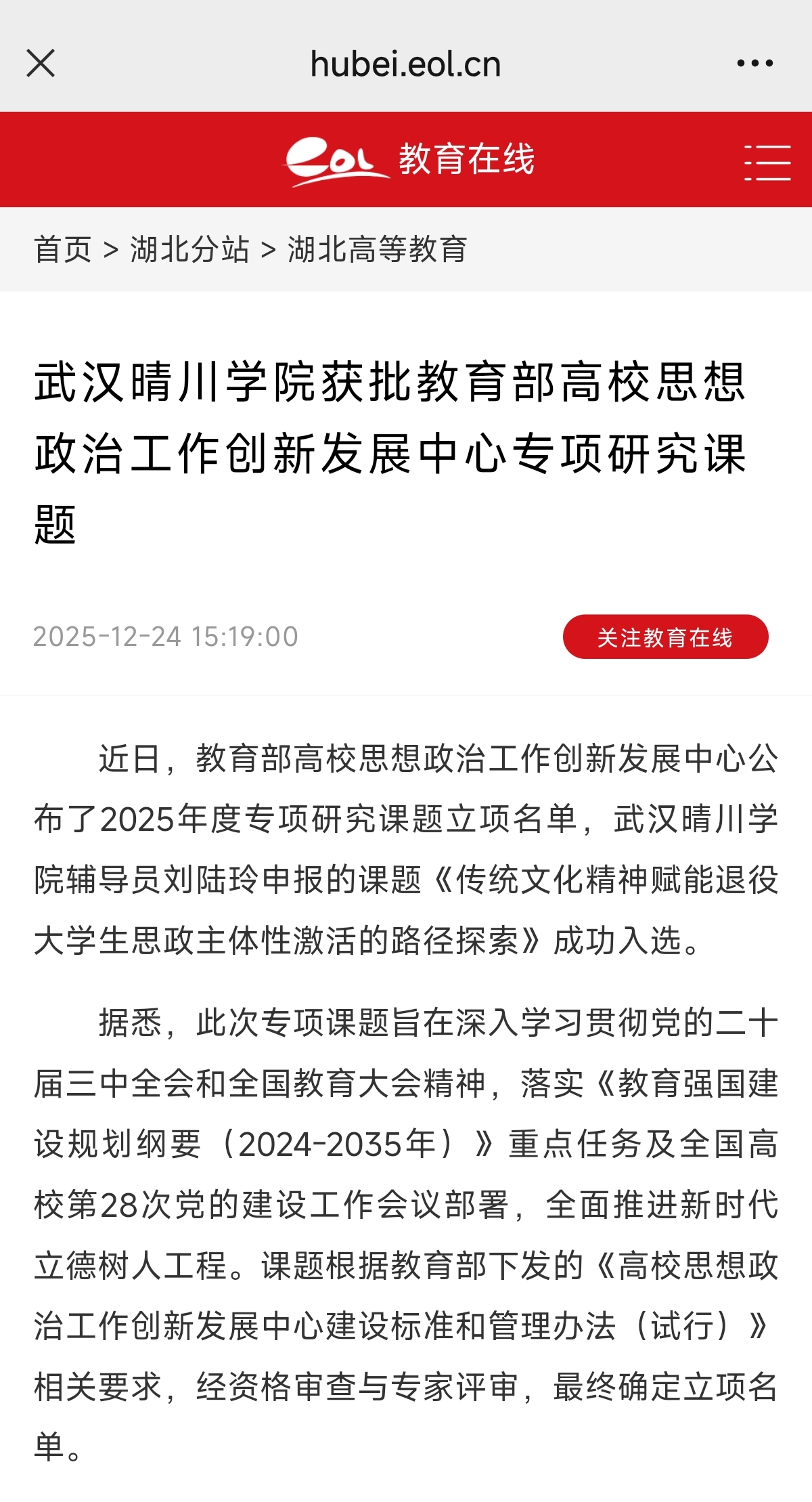 近日,教育部高校思想政治工作创新发展中心公布了2025年度专项研究课题立项名单,武汉晴川学院辅导员刘陆玲申报的课题《传统文化精神赋能退役大学生思政主体性激活的路径探索》成功入选。