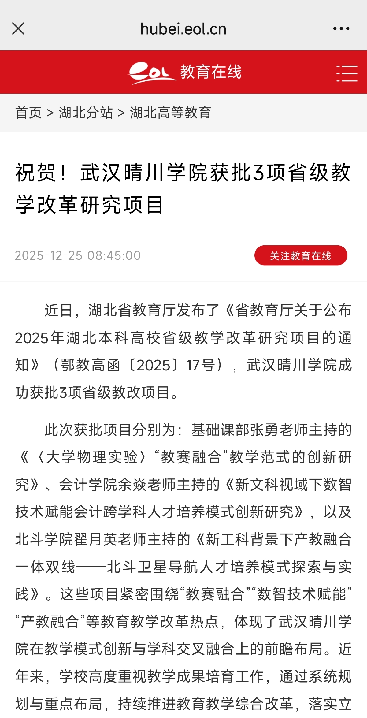 此次获批项目分别为:基础课部张勇老师主持的《〈大学物理实验〉“教赛融合”教学范式的创新研究》、会计学院余焱老师主持的《新文科视域下数智技术赋能会计跨学科人才培养模式创新研究》,以及北斗学院翟月英老师主持的《新工科背景下产教融合一体双线——北斗卫星导航人才培养模式探索与实践》。这些项目紧密围绕“教赛融合”“数智技术赋能”“产教融合”等教育教学改革热点,体现了武汉晴川学院在教学模式创新与学科交叉融合上的前瞻布局。近年来,学校高度重视教学成果培育工作,通过系统规划与重点布局,持续推进教育教学综合改革,落实立德树人根本任务。此次省级教改项目的获批,正是学校持续深化教育教学改革、长期注重内涵建设、不断优化人才培养机制的成果体现。下一步,学校将进一步加强项目统筹指导,完善过程管理与支持保障,推动教学改革与实践创新深度融合,切实提升应用型人才培养质量,为区域经济社会高质量发展贡献教育力量。(通讯员:蒋丽果)